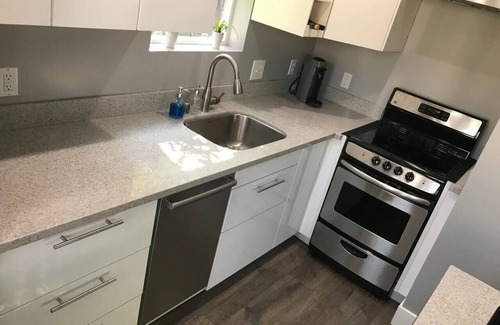 - The kitchen comes fully equipped with high-end appliances, quartz countertops, Keurig coffee maker, and an eat-in island.