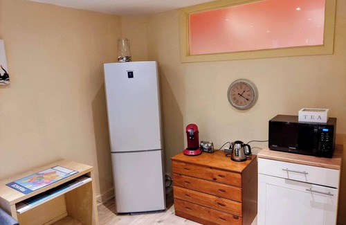 - Fully-equipped kitchen with microwave, coffee machine (Senseo), electric kettle, toaster, pots and pans, plates, bowls, glasses, and cooking utensils