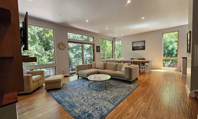This luxury home is designed for comfort, style, and relaxation in the heart of the Santa Cruz Redwoods.