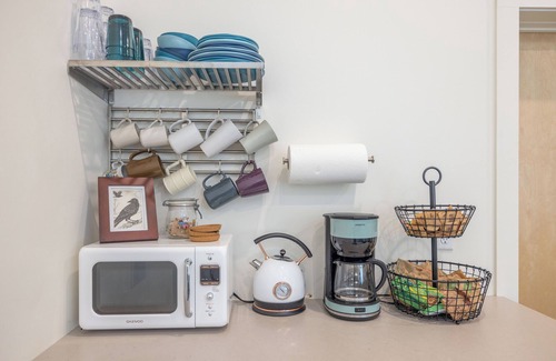 Beverage & breakfast bar stocked with coffee, tea, electric kettle, microwave, mini-fridge, and complimentary snacks