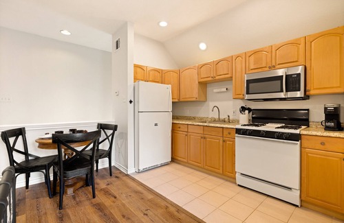 Bedroom 6/Studio (upper level, above the game room) — Two queen beds, Smart TV, kitchenette with refrigerator, electric range, microwave and coffee maker, and a dining table with seating for three. The private bathroom offers a shower.
