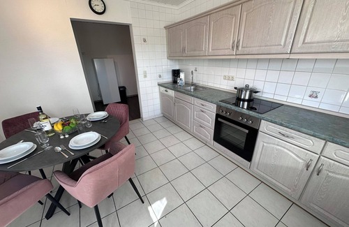 The Eickhof offers a delightful blend of modern amenities and traditional charm. You will find a fully equipped, closed kitchen featuring a 4-burner stove, an oven, a microwave, a dishwasher, and ample space for culinary adventures. Enjoy meals together in the cozy dining area with enough room for all. The living room invites you to relax with its inviting seating arrangement, which includes a comfortable sofa, armchairs, and a charming wood-burning stove that creates a warm and welcoming atmosphere. For your entertainment, the house is equipped with two televisions with satellite channels and Wi-Fi, ensuring you stay connected and entertained at all times.