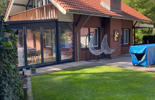 Beautiful, modern, and sleekly decorated holiday home with a gleaming, nicely equipped open kitchen to prepare delicious meals and a heated conservatory overlooking the garden. Furthermore, the house has a romantic sitting area and a bathroom with a bathtub. On the first floor are two bedrooms with lovely box-spring beds. The large private garden offers plenty of privacy and is perfect for relaxing