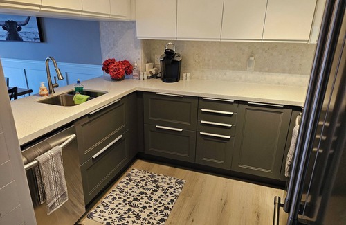 The cozy living space nicely blends with the dining room, creating a welcoming atmosphere. The kitchen is well-appointed with a stove, full-size fridge, dishwasher, and microwave. All kitchen essentials are provided. We advocate for eco-conscious practices, urging guests to recycle and compost and minimize the use of packaged products.