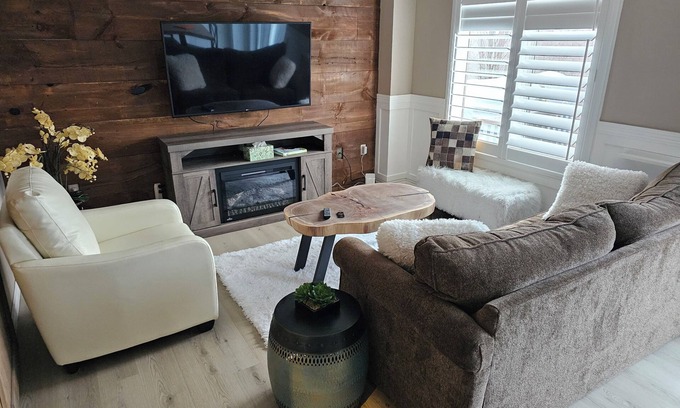 We invite you to stay in our cozy, pet-friendly home in a quiet Midland neighbourhood. The house offers three bedrooms upstairs and one downstairs, each with queen-sized beds and TVs.