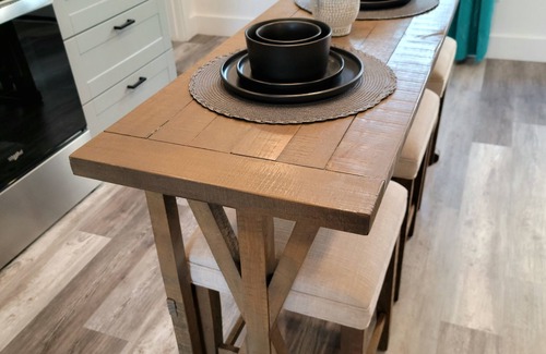This spacious and modern kitchen is designed to inspire your culinary creativity and make you feel at home. You will love the sleek black brushed granite countertops, the stainless steel Whirlpool appliances, and the island table that offers plenty of room for preparing and serving your very own culinary creations. The kitchen also features a unique handmade surf board light floating above the island table, adding a touch of coastal charm and warmth to the space. The chopblock floating shelves provide ample storage and display options for your cookware and utensils. The kitchen is fully stocked with everything you need to cook almost anything, from pots and pans to spices and oils. Whether you want to whip up a quick breakfast, a hearty lunch, or a gourmet dinner, you will find everything you need in this kitchen.