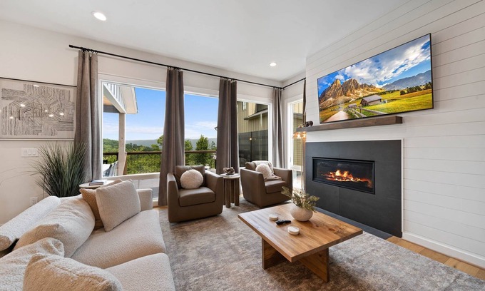 Step inside to an airy, open-concept main level where every inch speaks of thoughtful design — from the gas log fireplace and high-end furnishings to the custom tile work and designer hardware that grace every bathroom, comfort and luxury are around every corner. The heart of the home is warm and inviting, with a fully-stocked gourmet kitchen, cozy living area, and a wall of glass doors that invite you onto the main deck. Out there, you'll find outdoor dining, a crackling wood-burning fireplace, a mounted TV, and sweeping mountain views that practically demand you stay for "just one more sunset."