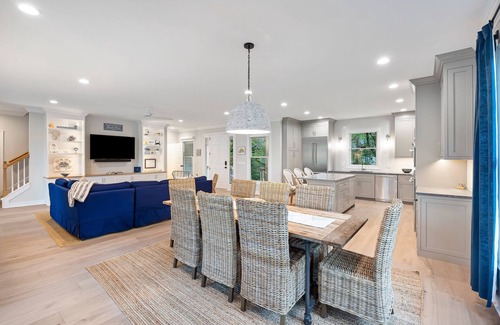Upon entering the home, you are greeted with tasteful decor with pops of coral and neutral tones. The stylish main living room features comfortable modern furnishings and a flat screen television mounted over the fireplace (*not for guest use). The kitchen is fully equipped and has everything you need to make a delicious home cooked meal. The main dining table seats 8 guests with an additional 3 bar stools at the island counter top.