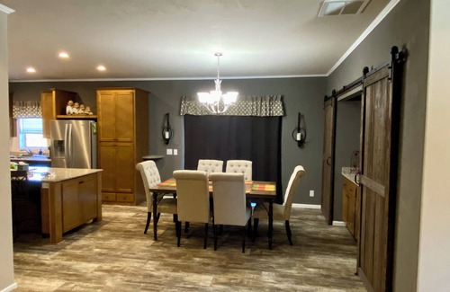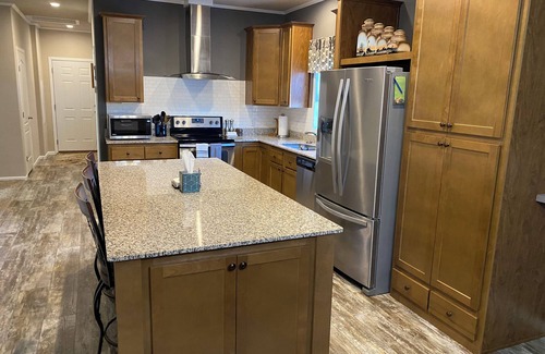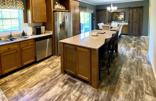 There are 3 full bedrooms, 2 of which have queen size beds with the third having a twin bunk (150 lb max / ages 6 and up) over queen. It has a full kitchen complete with stove top, oven, fridge / freezer and a spacious island that seats 3 people. There is also a formal dining table that seats 6 people.