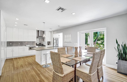 A modern designed house is ready to accommodate you. A tropical, backyard oasis provides a lush enclosed, private backdrop to enjoy your South Florida vacation. The secluded pool has some comfy chaise lounges to let you lay back and relax.