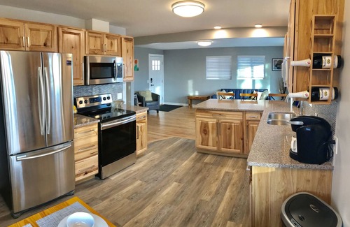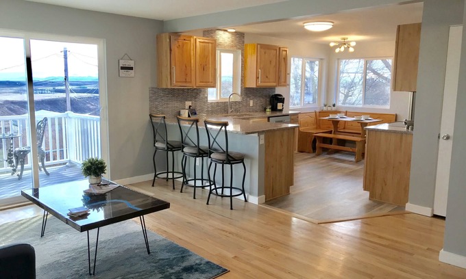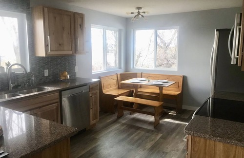This home has 4 bedrooms, 2 bathrooms and plenty of space to relax! There are two seating areas, one on each level. In addition to all the beds, there is a futon upstairs, and a large couch downstairs if additional sleeping arrangements are needed. We have a Pack N' Play for the littlest guests available upon request. Wake up in the morning with a cup of coffee on the back deck, overlooking Cut Bank Creek, and Glacier National Park in the distance. Enjoy the built in horseshoe pits with family and friends, or grab some popcorn and have a movie night inside. The smart TV can connect to your own streaming account. Cook great meals in a full size updated kitchen, equipped with all the brand new appliances and cookware you'll need.