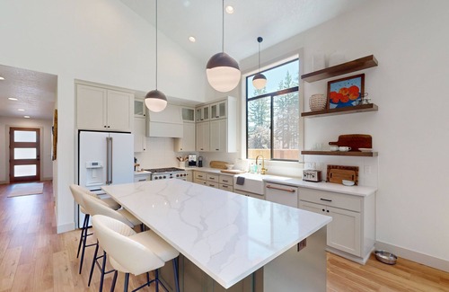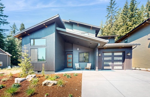 Escape to this modern-designed house in Detroit, Oregon, where you can enjoy a private backyard oasis complete with patio furniture, a grill, and a covered outdoor area with additional seating. The large windows throughout the home flood the space with natural light, creating a bright and inviting atmosphere for your stay.