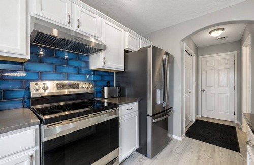 The house features high-end furnishings, including two queen sleeper sofas and multiple bedrooms outfitted with premium memory foam mattresses to ensure a restful stay for all your guests. Gather around the dining table, which comfortably seats eight, or enjoy casual meals at the kitchen counter. The recently remodeled kitchen and bathrooms boast beautiful granite finishes, adding a touch of sophistication. Step outside to discover an enchanting outdoor space, complete with a firepit and Adirondack chairs, perfect for post-wedding gatherings under the stars. The fenced backyard offers privacy and a safe area for children or pets to play while you relax and celebrate.