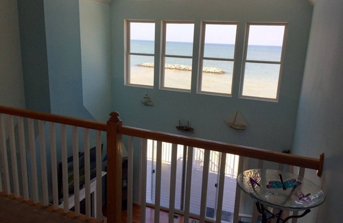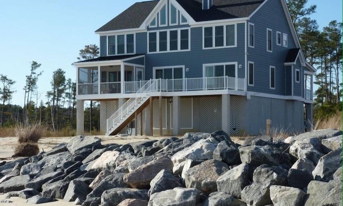 Our cozy, modern Beach House is situated 100' from the water with a private beach extending hundreds of feet. The house has incredible views overlooking the widest portion of the bay from every room with huge bay windows off the two-story family room.
