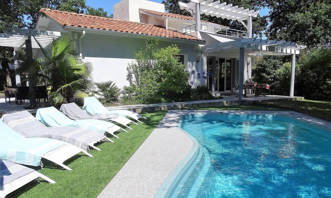 Ideally located 800 m from the beach, on a 1000 m2 plot in a quiet area, this house restored with modern tones and zen colors can accommodate a family of 6 to 8 people. It has a swimming pool heated from April to October with security cover. 3 bedrooms including a master suite on the first floor, a bathroom and a separate toilet. The house is fully equipped, sheets, towels and tea towels are provided; beach towels are to be brought.