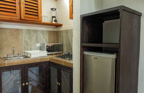 Relax in this stylish room with a king-size bed, full bathroom, and air conditioning. Cook light meals in the kitchenette with a stove, microwave, sink, coffee maker, and minibar. A cozy table for two is perfect for dining or getting work done. Whether you're here to unwind or explore Isla Mujeres, this space offers the perfect blend of comfort and convenience—just a short stroll from the Caribbean Sea.