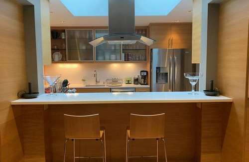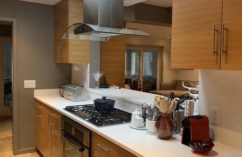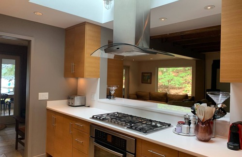 A modern chef's kitchen with large skylights and a new outdoor gas grill provides complete cooking alternatives for any meal. A breakfast bar with two stools adjacent to the kitchen is a lovely place to enjoy conversation while cooking in the kitchen.
