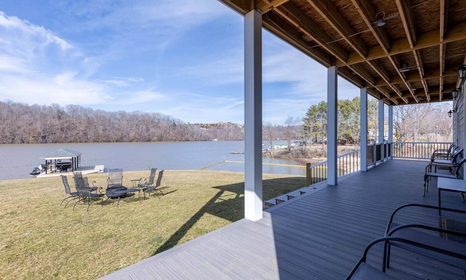Modern lakefront home with wraparound decks, firepit, and stunning water views on both levels. | House in Hiwassee