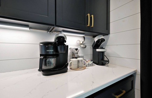 Step inside to a warm, inviting interior featuring high ceilings, shiplap walls, and stylish, cozy furnishings. The open-concept living space includes a fully equipped kitchen with stainless steel appliances, a Nesspresso coffee machine, and a comfortable living room with a fireplace and smart TV—ideal for unwinding after a day outdoors.