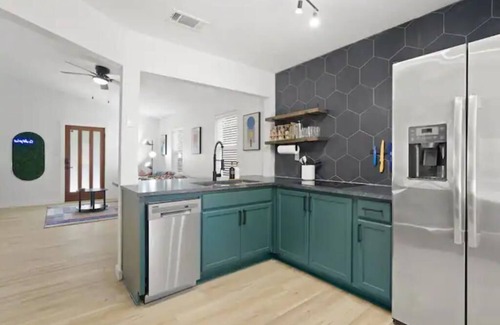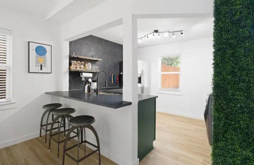 Full sized refrigerator, electric cooktop, dishwasher, barstool seating, washer/dryer, pots/pans & all essentials. Coffee station with french press.