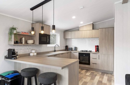 A modern lodge in Mullacott Park perfect for a trip to North Devon. The master has a king bed & ensuite, while the second bedroom offers 2 single beds. A 2nd bathroom ensures convenience. The open-plan living area features a well-equipped kitchen with all the mod cons. Relax in the living room with a smart TV or step outside to the decking area to enjoy the sun. Located between Ilfracombe & Woolacombe, it has easy access to beaches & attractions. Free parking right by the lodge. Dogs welcome!