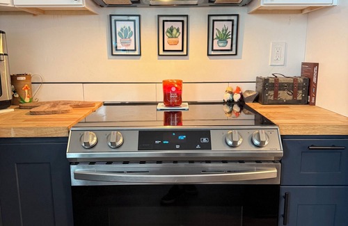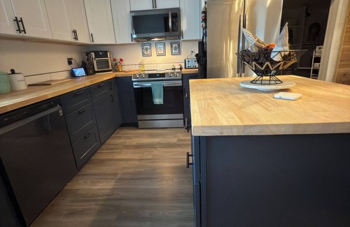 👨🍳🫶🏼👩🍳Kitchen: Kitchen & Dining: This fully-functional, open-concept kitchen is the perfect blend of style and practicality. With a deep granite composite sink, dishwasher, and filtered water on tap, you'll have everything you need to keep things clean and stay hydrated. The smart 4-burner stove (hot plate) makes cooking a breeze, and the kitchen is stocked with all the essentials for a memorable stay. Whether you're brewing coffee with the drip maker or French press, or crafting a gourmet meal, you’ll feel right at home. The butcher block countertops add warmth, while the custom keg barstools offer a fun, unique touch to the space.