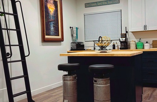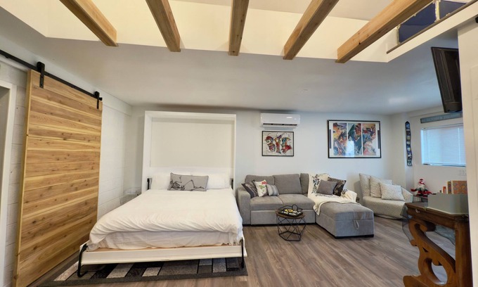 Welcome to our charming and modern guest house, offering a spacious and versatile living area with open floor plan and smart storage solutions. With an expansive kitchen designed for those who love to cook. We’ve stocked the kitchen with all the high-end appliances and tools needed to prepare home-cooked meals, making it the heart of the home. One of a kind furniture is placed throughout the home, and custom features highlight the craftsmanship in this custom build. The California king Murphy bed tucks away easily to open up the space, making the 750 sqft feel like over 1000. For additional sleeping arrangements, there’s a hidden loft bed, accessible by a telescopic ladder creating a fun interaction with the home. A pull-out couch for extra guests and is also equipped with cup holders and usb ports when you’re lounging and watching a movie with freshly popped popcorn in our popcorn machine.