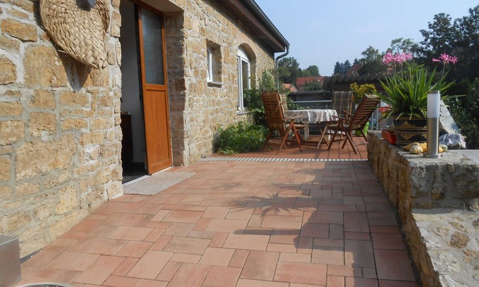 We would like to offer you a very individual apartment in Mediterranean style on the outskirts of Apolda. There are 120m² plus a large terrace overlooking the garden. Fully equipped exclusive kitchen, light-flooded living room fireplace, desk, TV, internet. The loft is quiet with lots of nature all around, almost at ground level and barrierearm, underfloor heating in the living area, in the sleeping area radiator, high quality granite floor on the ground floor, laminate in the sleeping area. It is 13 km to Weimar, to Jena too.