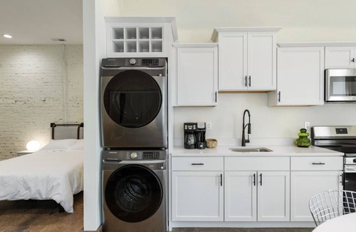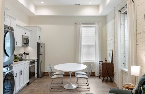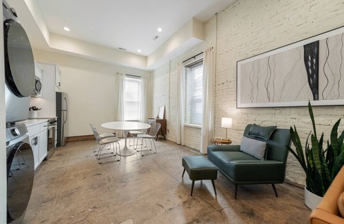 This modern first-floor loft offers a sleek, contemporary vibe with polished concrete floors, chic furnishings, and all the comforts you need for a relaxing stay. Unwind in the spacious rainfall shower, sink into the cozy queen bed, and enjoy making a home-cooked meal in the fully equipped kitchen and dining area.