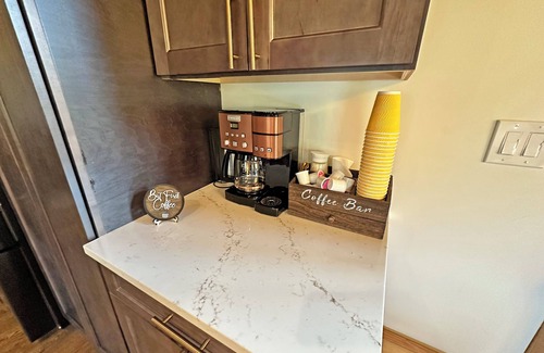 - Kitchen supplies: pots & pans, dinnerware, bakeware, plasticware for children, toaster, blender, dual coffee maker (K-cup and drip), glassware, food storage containers, wine glasses, and more!