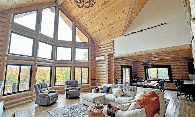 This spacious 6-bedroom log home in Albany, NH, is perfect for large groups. Located near the scenic Kancamagus Highway, it offers a true rustic retreat in the White Mountains. Surrounded by serene pine forests, this charming log home offers comfort and privacy while being close to trails and attractions. Perfect for those seeking a peaceful mountain getaway.