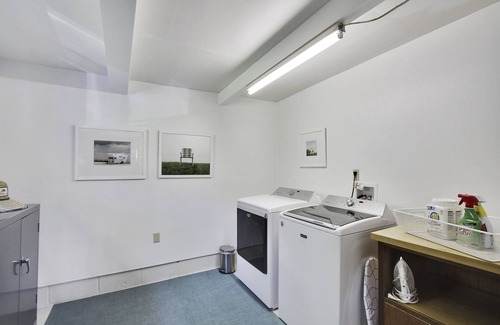 Modern Love has a clean, airy design with exposed wood beam ceilings, quartz countertops in the kitchen, and wood floors throughout. You can't help but stop and admire the beautiful ocean view through the wall of windows in the open living area. The well-equipped kitchen (Heath table/serve ware, LeCreuset cookware) features a glass tile backsplash and stainless steel appliances. Enjoy dining via the open plan kitchen or al fresco on the west-facing deck after a day at the beach, warming up by the fireplace, or exploring the area.