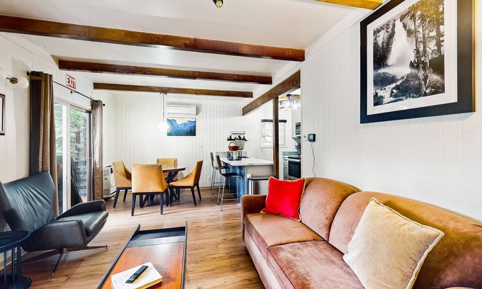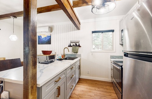 Inside, warm up and relax in front of the living area's wood-burning fireplace. Steps from here, the well-appointed, full kitchen boasts stainless steel appliances, a coffee station, and marble countertops. No modern convenience goes unnoticed as you and your guests will also enjoy access to a shared washer/dryer, partial air-conditioning, a streaming-capable TV (using your own accounts), and an EV charger. This unit is part of a small duplex and is located on the first floor the lower unit. You will share the main entrance with additional guests but will have a private entrance to your unit. The other unit is located above. Please note that you may hear noise from guests staying in the unit above