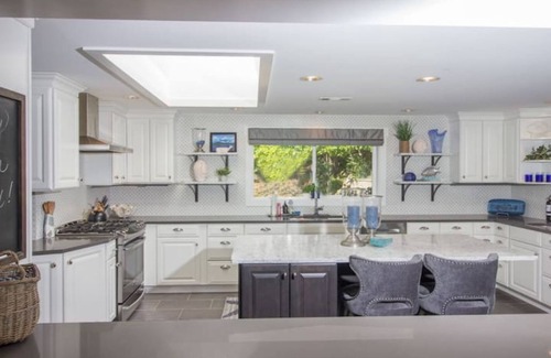 The gourmet kitchen is stocked with everything a chef would need to cook any meal you desire. Gas stove, microwave, coffee bar, high quality dinner wear and cooking utensils including Hexclad pans.