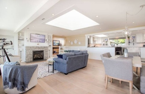 The living room is beautifully appointed with a large sectional couch, fireplace, swivel chairs by the windows for the best view of the inlet, a Samsung Art screen TV and a telescope! The dining area easily seats 8 guests comfortably.