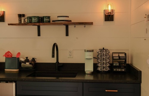 This Korean-inspired shed-style cabin is 21’x15’ with dramatic 18’ ceilings, a queen bed with giant windows overlooking the woods, a full bathroom (toilet, sink, and a stupidly luxurious shower), a sleeper sofa with (an actually comfortable) queen foam mattress, a seating area nook with built-in cushioned benches and live edge table perfect for a game of cards or working on your laptop (don’t do it!), and a small kitchenette (sink, granite countertop, electric hot top, mini refrigerator, dishes, silverware, basics for cooking, kettle, etc.). This cabin comes supplied with linens (sheets, down comforter, towels for four, and pillows), linens for the sleeper sofa (sheets, pillows, and blankets), and two sleeping pads and pillows if you have additional guests (i.e. kids) sleeping on the floor. The cabin also has an outdoor seating area with four Adirondack chairs, a fire ring (w/ integrated grill), a small picnic table, and bistro lights that make for a magical outdoor experience.