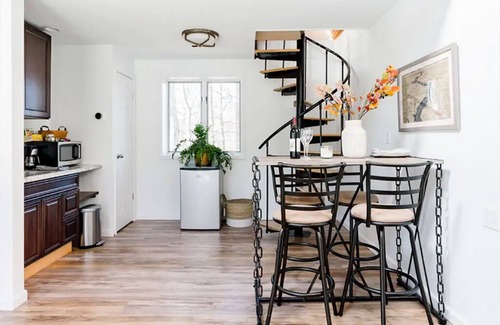 The guest cottage is a spacious retreat with 20ft ceilings, skylights, and a glass front blending indoor and outdoor living. It features a sleeping loft with a queen Tempurpedic mattress overlooking the living space, accessible via a spiral staircase. The cottage also includes a small kitchenette, a convertible twin sofa bed, a full bathroom, and its own TV. Perfect for extra guests or a private getaway! See our other listing for more cottage details.