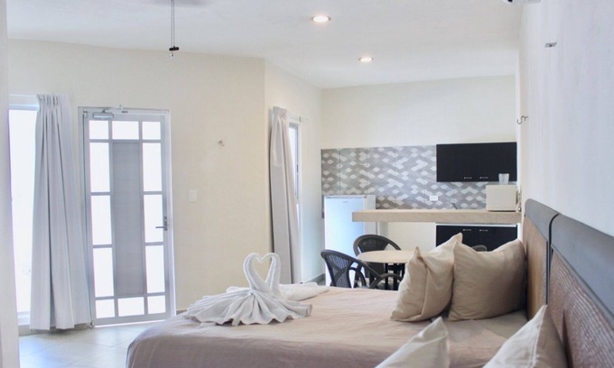 Newly built modern studio apartments a stone's throw from the white sand beach. Enjoy all the amenities of a hotel while experiencing life in a quaint Yucatecan fishing village. Stroll the beach, lounge in the pool or relax on the rooftop patio taking in the warm carribean breeze. Each unit includes air conditioning, a flat screen TV with cable, WIFI, and a kitchenette with sink, fridge and microwave.