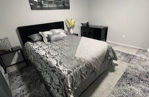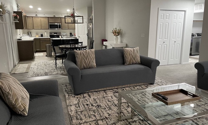 Your stay at this exceptional retreat includes a fully stocked kitchen designed for entertaining, featuring modern appliances and ample dining space. The open-concept layout seamlessly connects the living room—equipped with comfortable seating and a large flat-screen TV—to the dining area, perfect for hosting pre-wedding celebrations or intimate family gatherings. With four generously sized bedrooms and two bathrooms, this property comfortably accommodates large groups, allowing friends and family to come together in style. Additional features like a private fenced backyard, outdoor grill, and cozy furnishings ensure that everyone feels right at home.
