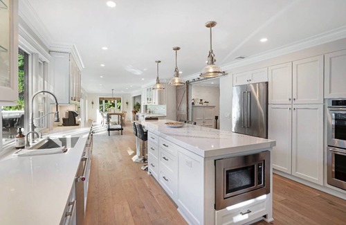 At its heart, a modern chef's kitchen boasts a sleek, open layout with pristine white cabinetry and a seamless flow perfect for entertaining. The spacious living areas lead effortlessly to the outdoors, where a sparkling pool, fully equipped outdoor kitchen, and BBQ area create the ultimate retreat.