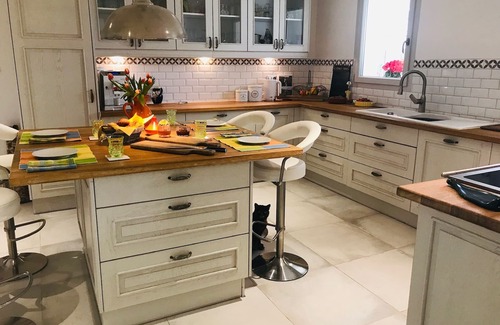 New and spacious house, 3 large bedrooms, all with en-suite bathrooms with Italian showers; each bedroom has a super-king bed which can also be used as twin beds; There are three living rooms, the first set with the dining room; the second upstairs with an incredible view and the third is the garden room, the perfect place to relax. The large, modern kitchen has an island for dining as well. There are two balconies in the front and behind; large terraces and a large and peaceful garden. The house is in a very quiet area but not far from St Emilion, Libourne, Bordeaux, Périgueux ; It is in the Dordogne and next to the Gironde and the Charente. It is extremely well equipped with everything of high quality. The perfect place for 6 adult friends / couples or families with older children Please note the pool is not fenced. Perfect to relax and enjoy the tranquility or to explore this wonderful region.