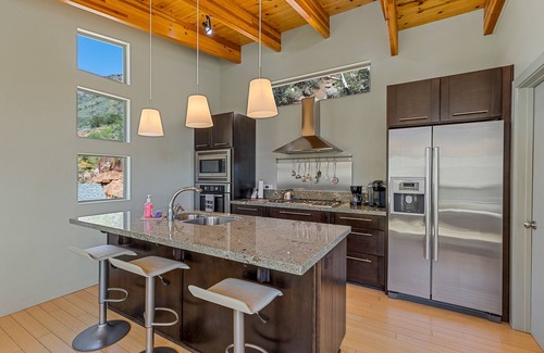 Prepare to be awed and inspired at our home- Painted Views. It is a modern loft home with tons of charm. This 2 story, alone home is located in an eclectic community. The community is located on Oak Creek; and right across from Indian Gardens in Oak Creek Canyon, just a few miles from Slide Rock Park. Its only 3.8 miles from uptown Sedona. Our home sits atop a hill with walls of windows for spectacular views from the entire top floor; which includes, the living room, kitchen, reading nook, master bedroom, and outdoor deck. Our home has natural wood flooring, ALL granite countertops in the kitchen and bathrooms, and all top end Bosch appliances. There are 2 flat screen TVs, each with its own DVD player, Direct TV, and high speed internet. We have a fully stocked kitchen (table settings for 8, glasses, pots and pans, knives, wine glasses and opener, utensils, and small appliances) just in case you may be inspired to cook. The master bath has a large glass enclosed shower with multi-level jets and a rain shower head. We have also supplied a blow dryer, an ironing board, and iron. Each bedroom has a pillow top queen bed, and the den has a sofa sleeper that sleeps 2. You will be staying in a luxury modern bungalow only minutes from town.