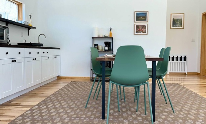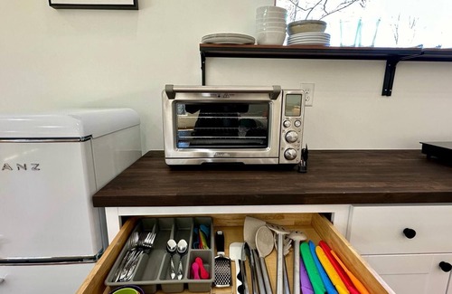 The large open space features several distinct areas. The well-equipped kitchen has a fridge, a two-burner induction cooktop, a large Breville convection oven/air fryer, and a microwave. Note that there is no dishwasher or a traditional range. There is a drip coffee machine and an electric gooseneck kettle with Peet's coffee and assorted teas.