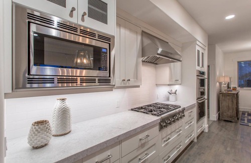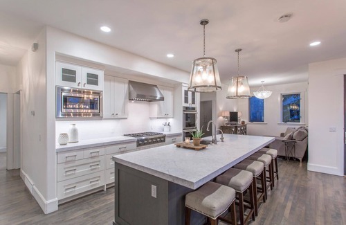 Gourmet Kitchen: The property boasts a chef's dream kitchen complete with marble countertops and a generous island, making it easy to cater for your wedding party or enjoy celebratory meals together.