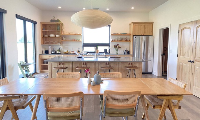 Peaceful and private mountain modern home in the heart of Teton Valley. 14 miles from Grand Targhee, 20 miles from Jackson Hole & Grand Teton National Park. Mecca of outdoor activities, mountain biking, skiing, hiking, fly fishing, paddle boarding, etc... Come back and relax in the wood-fired sauna and cedar hot tub, cold plunge and outdoor shower. Large open living space with 4k projector. Indoor and outdoor dining, floor to ceiling windows w/ incredible Teton views. Flexible check in /out.