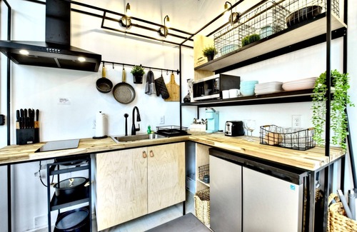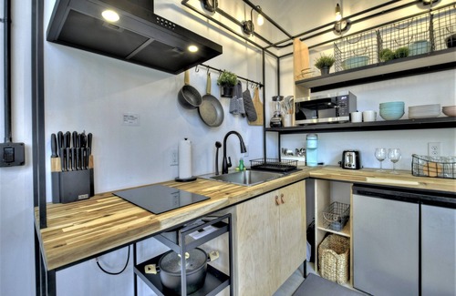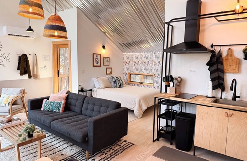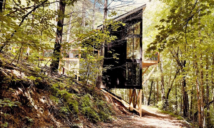 TREEANGLE is a design award winning cabin elevated from the ground, that conforms to the mountain's topography respecting the beautiful treed landscape where it is located. There is one bedroom with a queen bed, a comfortable modern kitchen , dining room, living room, one bathroom and a long wrapping balcony. Acces to the cabin is via the upper driveway which connects to the house through a bridge. There is a fire pit area on the lower driveway which is accessed by going down the upper driveway. The interior is a mix of industrial modern with warm materials such as the hardwood floors on the main level. The industrial look includes exposed joists and conduit. Regretfully we do not accept pets due to the owners allergy issues.
