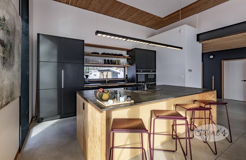 Features a kitchen island with seating for four, fridge/freezer, dishwasher and a Miele double wall oven.