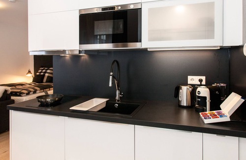 There is a fully equiped kitchen (fridge, 2 induction hot plate, microwave oven, Lavazza coffee machine, electric kettle, toaster, cutlery & dinnerware) and a bathroom with toilette and shower in the bath tub or a large shower