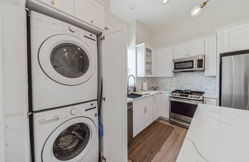 Enjoy a spacious and tranquil environment featuring high ceilings, abundant natural light, stylish and comfortable furnishings. An open concept living space complete with Smart TV provides you with easy access to a fully-equipped kitchen featuring new Energy Star stainless steel appliances, white- crisp cabinetry, quartz countertops, dish ware, and a mid-century modern gold chandelier. The elegant kitchen island with four seats has generous space to enjoy meals and is an ideal place to work with a cup of coffee. A private outdoor patio is yours to relax in for comfortable indoor-outdoor living.