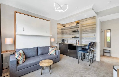 The queen sized bed is a Murphy bed! It easily pulls down from the wall and lifts back up again to reveal a 2-seater sofa. The bed will be pulled down in preparation for your stay.